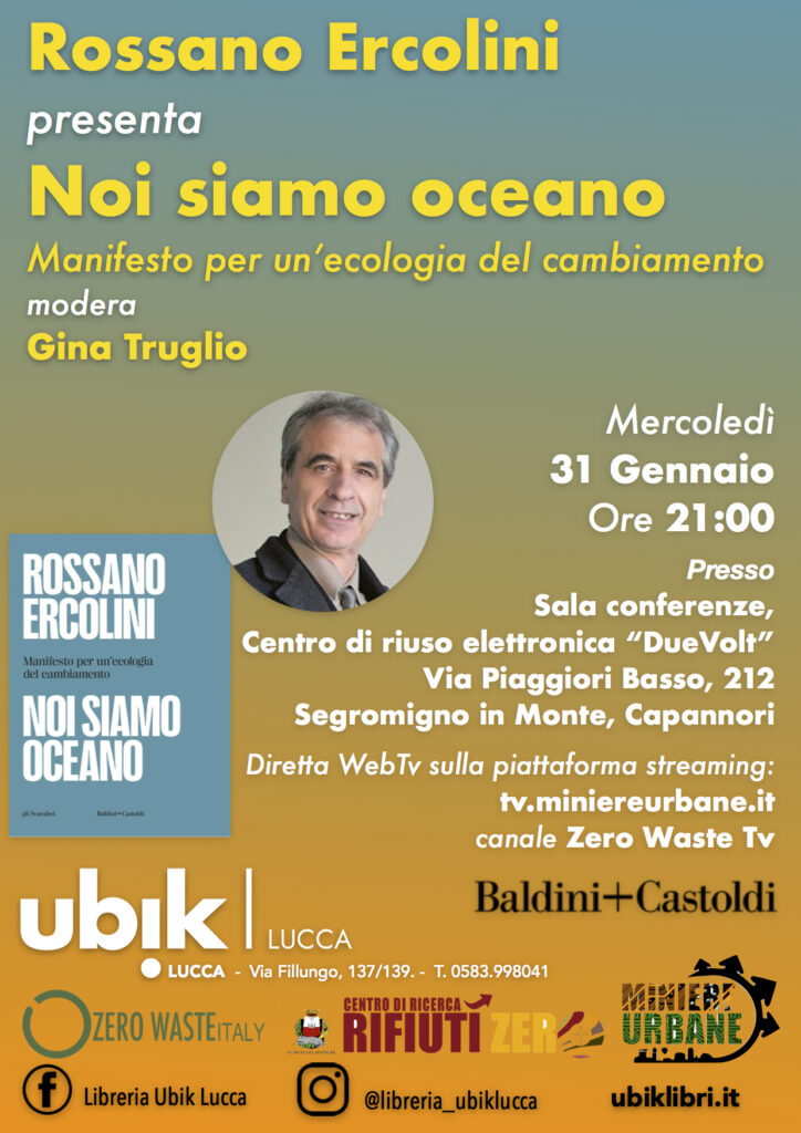 La prima presentazione pubblica del libro “Noi siamo oceano. Manifesto per un’ecologia del cambiamento” di Rossano Ercolini, organizzata dalla Libreria Ubik Lucca, avrà luogo mercoledì 31 gennaio alle ore 21.00 presso la sala conferenze del Centro di Riuso Elettronica “Due Volt”, sito in via Piaggiori Basso 212, Segromigno in Monte, Capannori (LU). Rossano Ercolini, noto ambientalista e vincitore del Goldman Environmental Prize, sarà presente per condividere con il pubblico le sue riflessioni sulla necessità di un cambiamento ecologico profondo, riflettendo sulle sfide ambientali e proponendo soluzioni concrete. Ercolini presenterà una visione illuminante sull’ecologia del cambiamento in questo nuovo lavoro che promette di ispirare e guidare il pubblico verso azioni positive per la salvaguardia del nostro pianeta. La presentazione è organizzata in collaborazione con “Miniere Urbane” e “Zero Waste Italy” e sarà moderata da Gina Truglio, titolare della Libreria Ubik Lucca. L’evento promette di essere un’occasione unica per esplorare in profondità le tematiche affrontate nel libro e per interagire direttamente con l’autore. Per coloro che non potranno partecipare di persona, l’evento sarà trasmesso in diretta sulla piattaforma streaming della Zero Waste TV a partire dalle ore 21.00, visibile a questo LINK. Unisciti a noi in questa serata straordinaria e segui gli aggiornamenti sull’evento sulle pagine Instagram e Facebook di Zero Waste Italy.