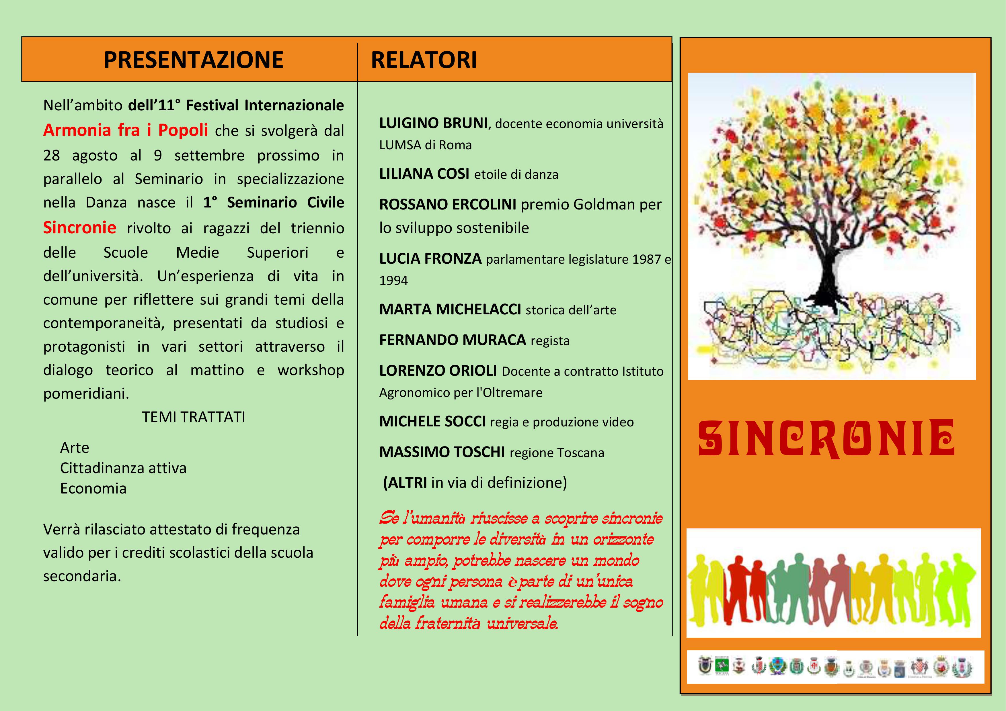 Mercoledì 7 settembre Rossano Ercolini sarà a Montecatini al 1° Seminario Civile “Sincronie” rivolto ai ragazzi del triennio delle Scuole Medie Superiori e dell’università, dove parlerà di cittadinanza attiva.